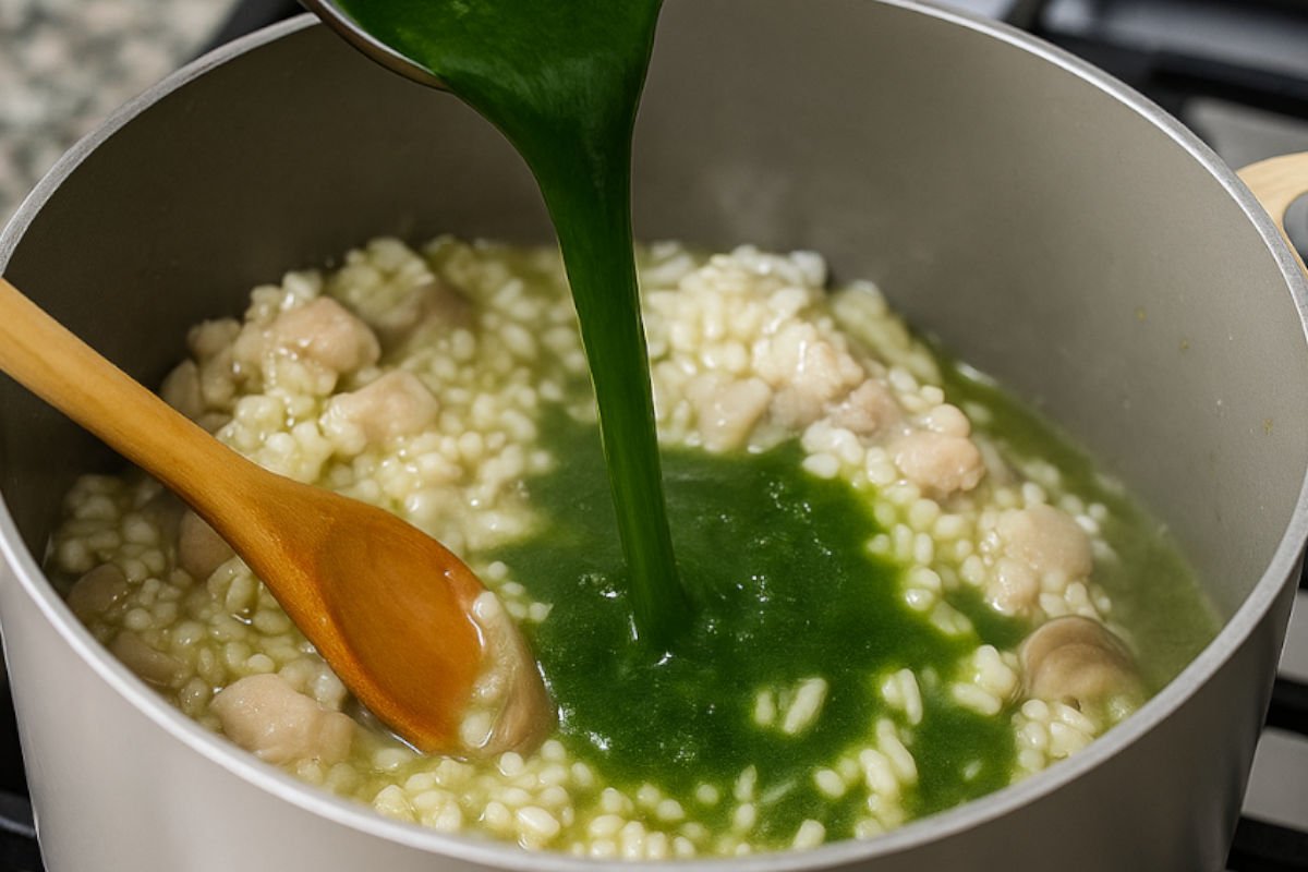 Comienza a incorporar el caldo caliente con espinacas, poco a poco y sin dejar de remover. A medida que el arroz lo absorba, añade más caldo. Este paso debe durar unos 18 minutos, removiendo con frecuencia para lograr una textura cremosa y evitar que se pegue.
